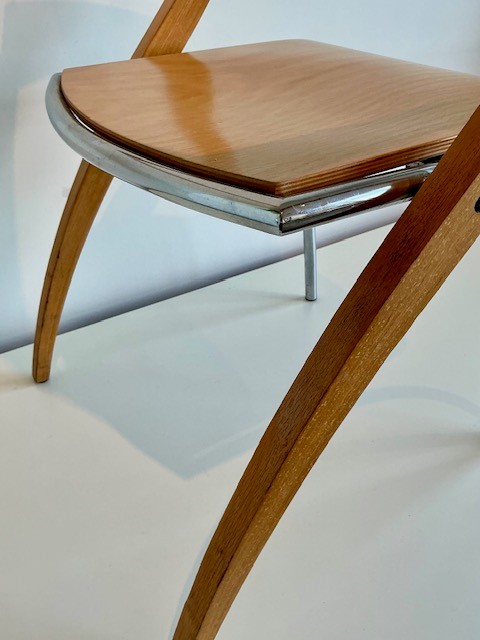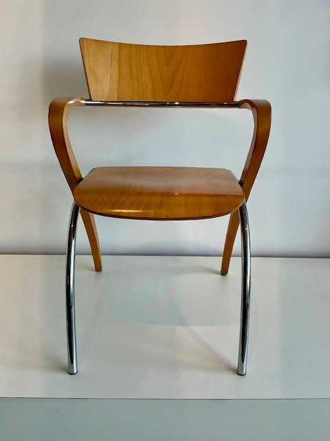 A vintage set of six Can Can dining room, canteen or conference chairs, designed by Danish design agency Komplot Design for German international contract furniture manufacturer Brunner. The design is from 1993. Easy to stack, handy for small spaces. Overall in good condition, slight signs of wear. Mixing chromed metal and beech laminated wood, the silhouette of this base evokes that of a french cancan dancer, hence its name.