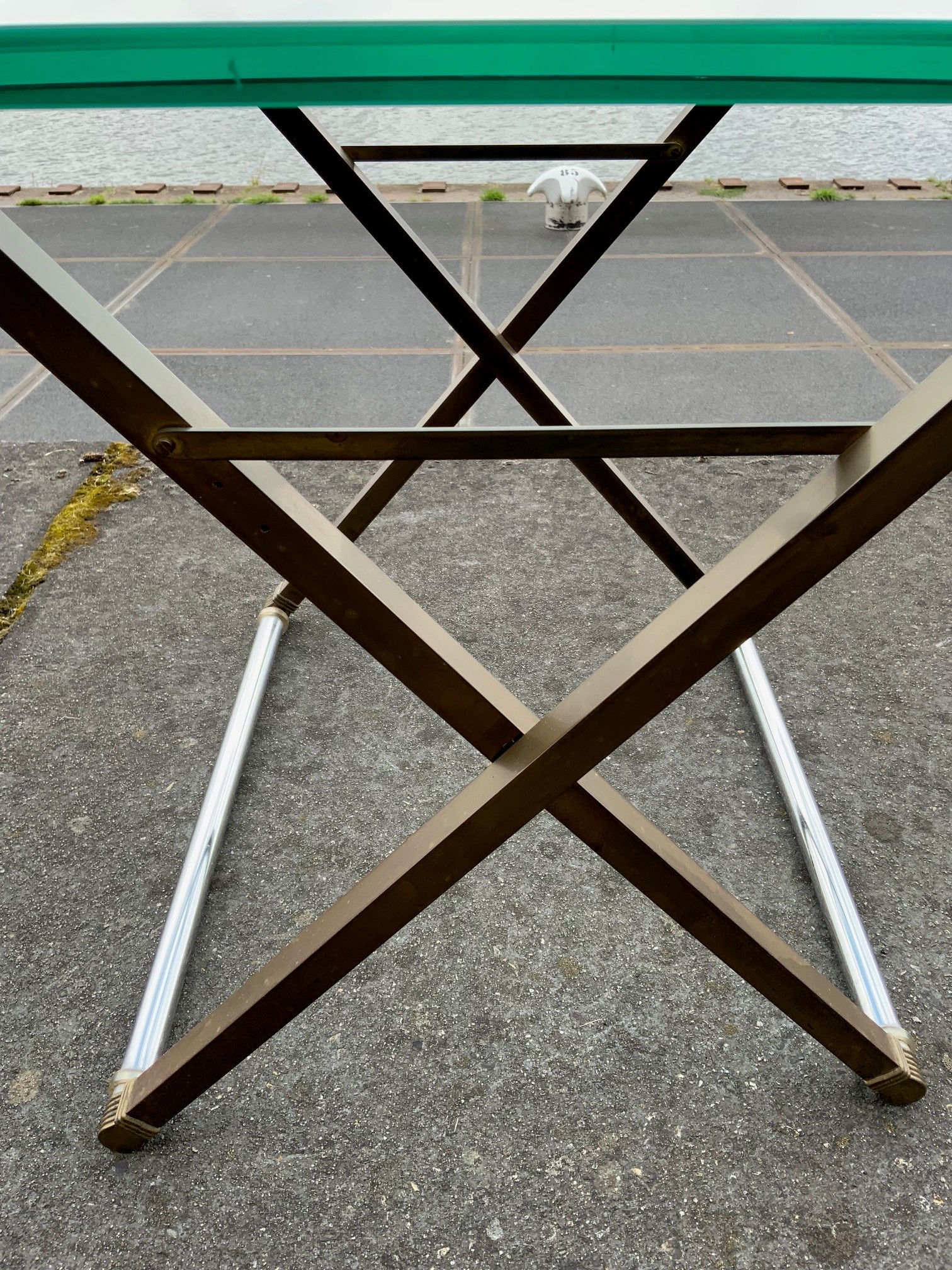 Beautiful highly decorative side table designed and manufactured by Peter Ghyczy, from the 1970s. This Hollywood Regency style side table is made of chromed rods connected to brass cross legs. The frame has an 18 mm thick glass top and is height-adjustable because it can be adjusted in 3 positions. Great timeless design by Ghyczy and in very good original condition. This table was intentionally not restored to preserve the beautiful patina of years. The glass plate is in perfect condition.