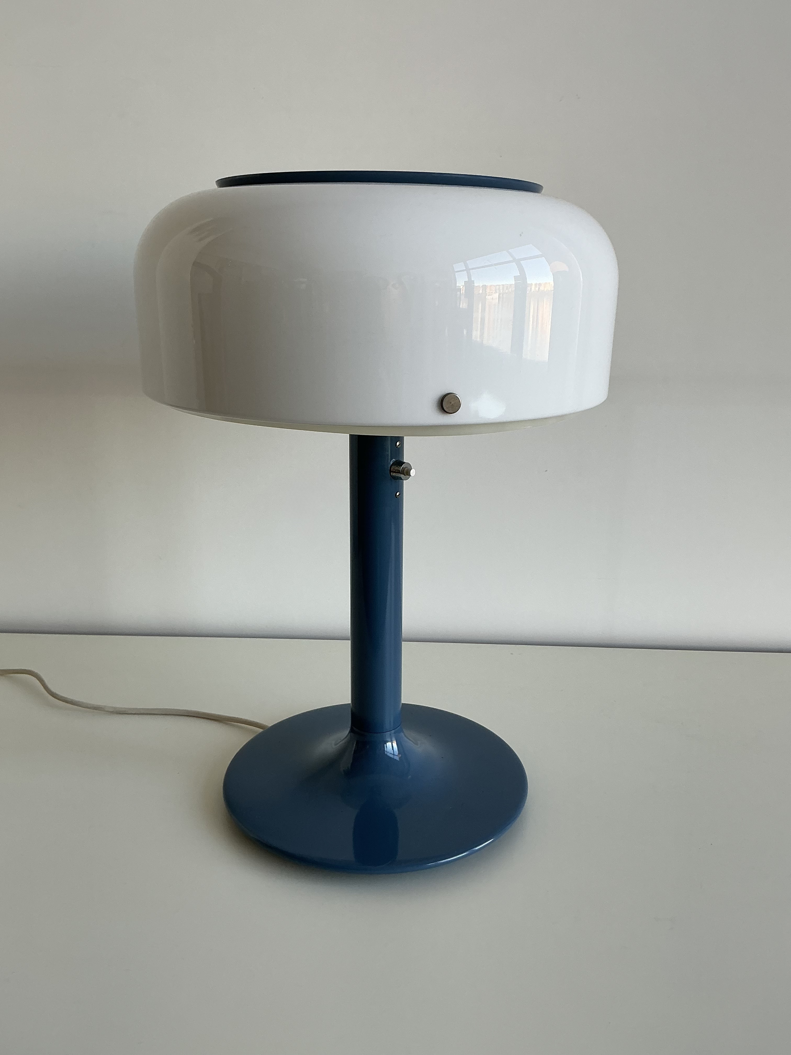 Tafellamp uit de jaren 60 ontworpen door Anders Pehrson voor Ateljé Lyktan gevestigd in Åhus in Zweden. Dit exemplaar in zacht blauw verkeert in perfecte staat. Door het filter onder de kap geeft de lamp een prachtig zacht licht. Metalen blauwe voet en kunststof kap. Gezien de leeftijd en kwetsbaarheid in extreem goede staat, omdat zowel de kap als het filter in veel gevallen scheurtjes of barsten vertonen. Niet bij dit exemplaar.