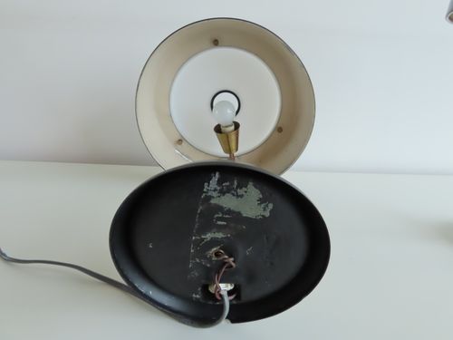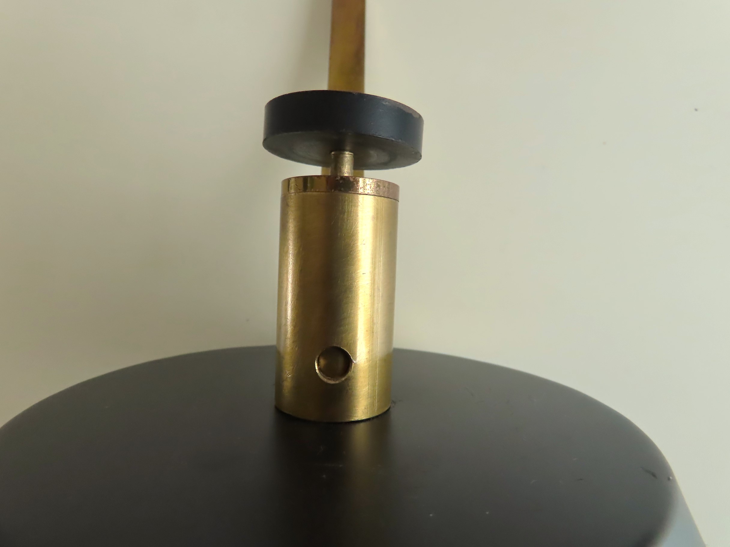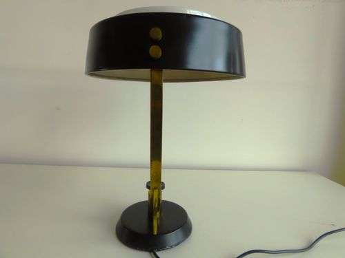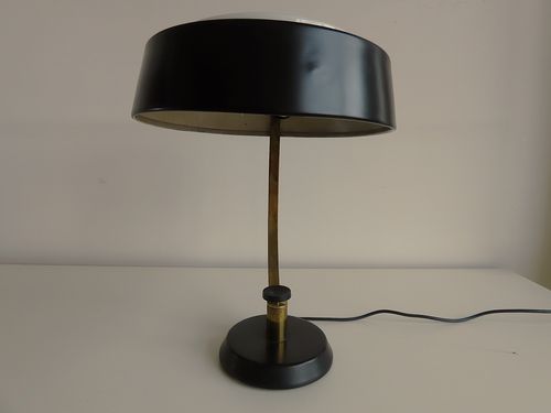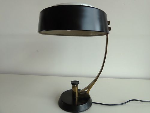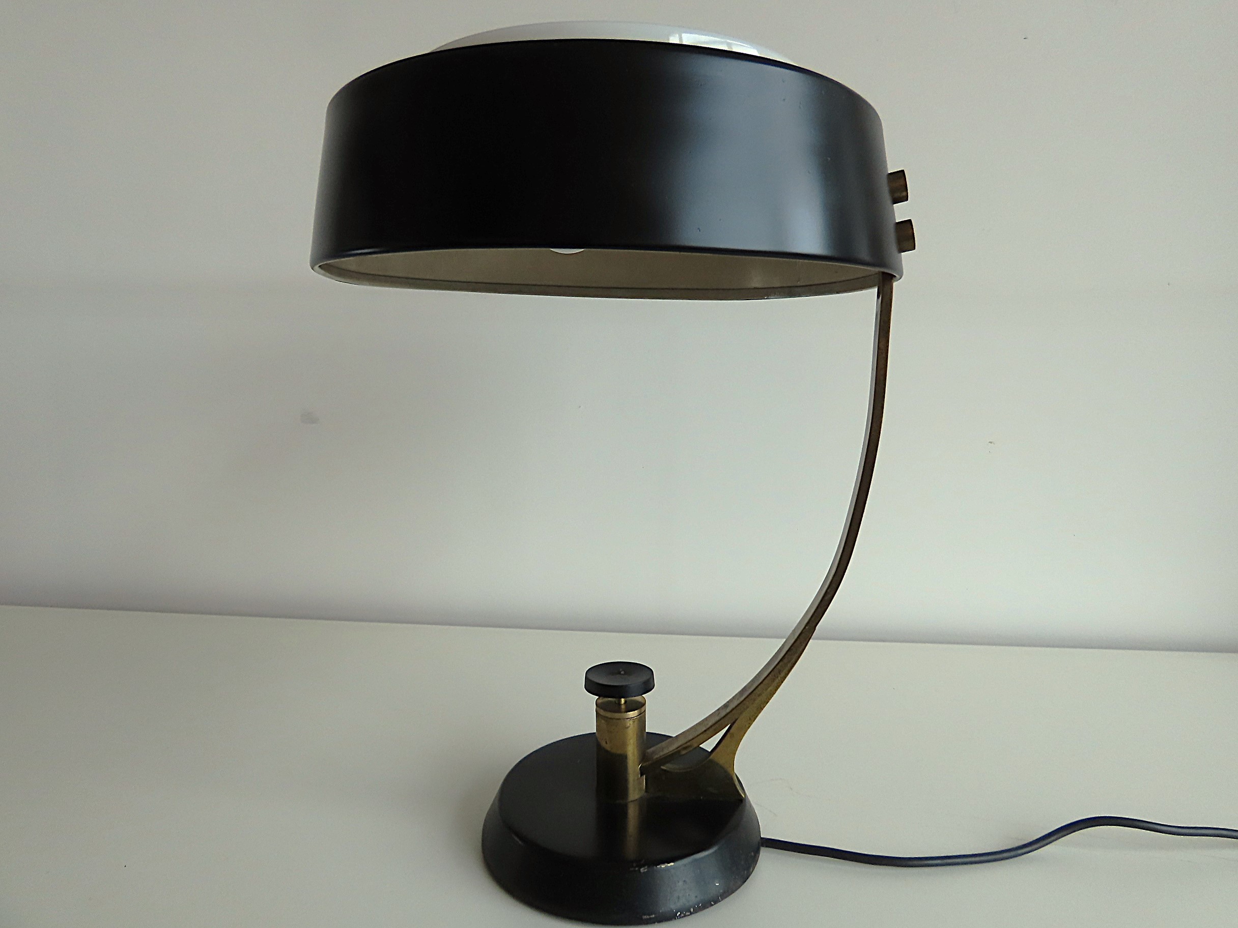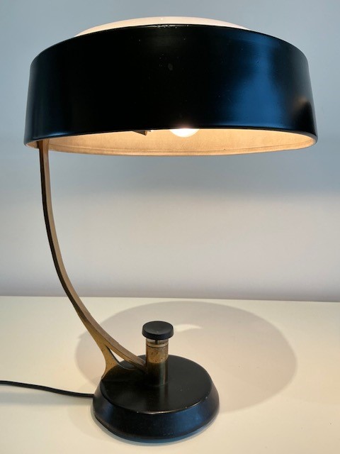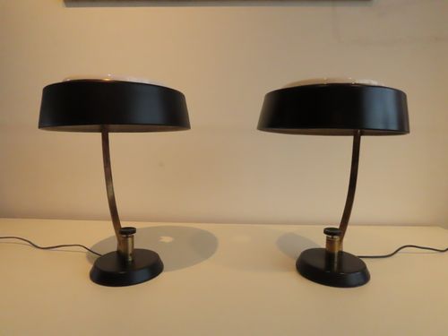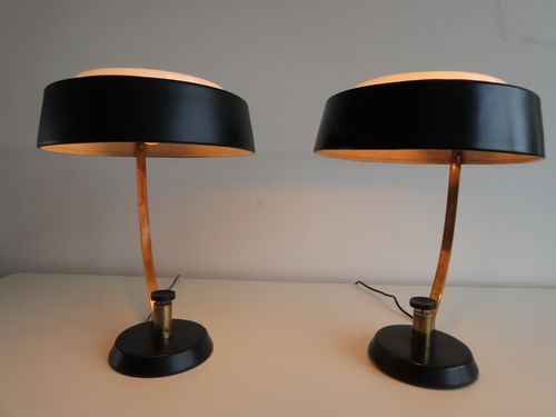 Een set van twee prachtige bureau/tafellampen uit de jaren 60 van de Italiaanse ontwerper Oscar Torlasco. Het armatuur van massief messing verbindt een zwarte metalen ronde kap en voet. In de voet zit de drukschakelaar om de lamp aan en uit te zetten. De witte kunststof binnenkap geeft een zacht, warm licht. De lamp bevindt zich in een mooie, originele, vintage staat met gebruikerssporen die horen bij lampen van deze leeftijd. Het messing is niet gepoetst, de kap en voet niet opnieuw overgespoten, dus het mooie patina dat de tijd op het messing heeft aangebracht, is behouden gebleven (zie foto's).