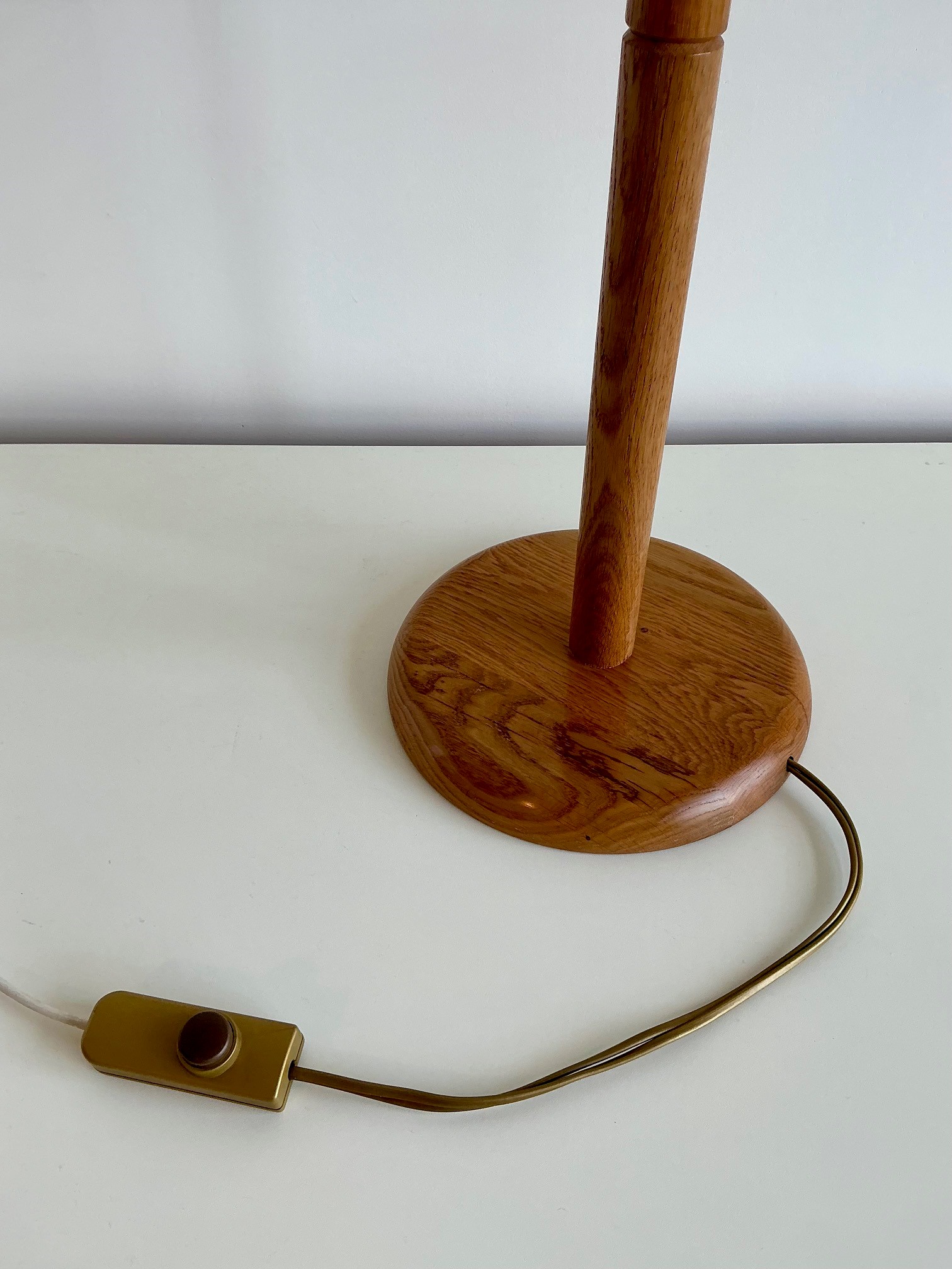 Deze lichthouten 'gooseneck' vloerlamp van Steinhauer uit de jaren 1970 maakt indruk met zijn eenvoudige ontwerp van hout en kunststof. De lamp heeft twee verstelbare lampenkappen die flexibel gericht kunnen worden - ideaal om te lezen of voor gerichte verlichting. De combinatie van lichtbruin hout en witte kunststof kappen geeft de lamp een klassieke Mid Century look die gemakkelijk kan worden geïntegreerd in verschillende interieurstijlen. De lamp wordt eenvoudig bediend met de voetschakelaar op het snoer, die het mogelijk maken om elke lamp afzonderlijk aan of uit te schakelen. De lamp is volledig functioneel.
